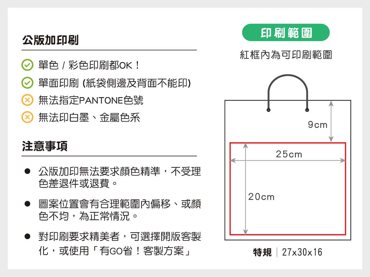 對印刷要求精美者、或對顏色有特殊需求,可選擇開版客製化,或使用「有GO省!紙袋客製方案」